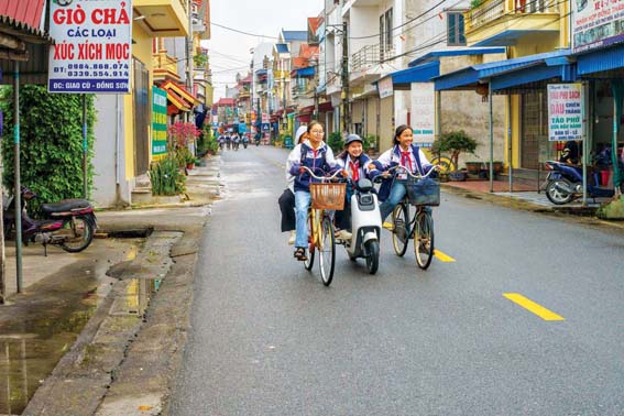 Children ride through the streets of Vân Cù village in Nam Ðịnh province.