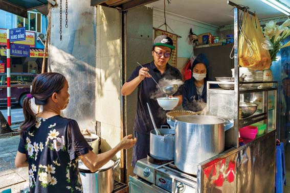 My glasses steamed up as the aroma of cardamom, cinnamon, and ginger rose from the hot soup in front of me. As I was about to plunge my chopsticks into the bowl of rice noodles and thinly sliced beef, a voice cut through Hanoi’s scooter traffic: “Excuse me.” I looked up to find a bespectacled fortysomething Vietnamese man seated several feet away. “How did you hear about this place?” Before I could even answer, he added, “No foreigners come here. No one knows about it except locals and hardcore phở lovers.”