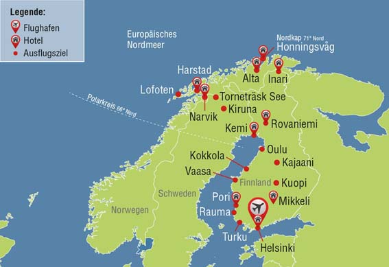 Du khách rời Phần Lan, trực chỉ Na Uy, đến Mũi Bắc Nordkapp (North Cape), điểm xa nhất của châu Âu nhô ra Bắc Băng Dương. Mũi Bắc là một trong những điểm nổi bật nhất trong chuyến đi. North Cape Hall, một tòa nhà trên cao nguyên North Cape, có phòng chiếu phim, khu triển lãm cung cấp nhiều thông tin về mũi đất này.