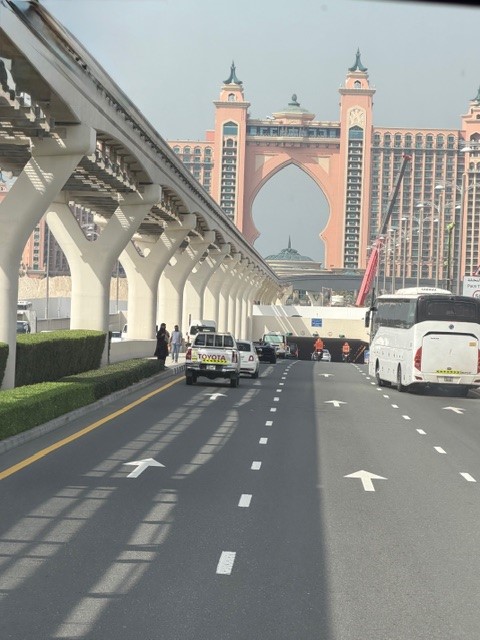 Sau đó chúng tôi đi thăm Palm Jumeirah. Đây là đảo nhân tạo được xây theo hình cây cọ (palm tree), với thân cây là con đường chính. Biệt thự và resort được xây trên những dải đất hình nhánh cọ rẽ ra từ con đường chính. Khoảng giữa các nhánh cọ là biển nên nhà nào cũng có bãi biển riêng của mình. Đây là khu dân cư đắt tiền nhất của Dubai. Phần đỉnh của cây cọ là những khách sạn cao cấp.