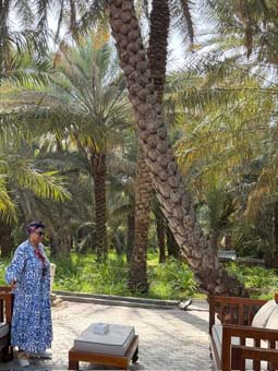 Sau đó chúng tôi đi thăm vườn chà là. Lúc này đã hết mùa thu hoạch nên chà là không có trái. Cây chà là có hai loại, cây đực và cây cái. Khi cây ra hoa, nhà vườn phải trèo lên ốp chùm hoa đực vào chùm hoa cái rồi cột lại. Cuộc “ái ân” này của cây chà là phải mất đến… ba ngày mới xong. Chà là được nhân giống bằng cách bứng cây con từ cây mẹ, mẹ đực thì con cũng đực, và mẹ cái thì con cũng cái. Chà là có nhiều loại với độ ngọt khác nhau, trái có màu càng đậm thì càng ngọt. Medjool là một trong những loại chà là ngọt nhất.