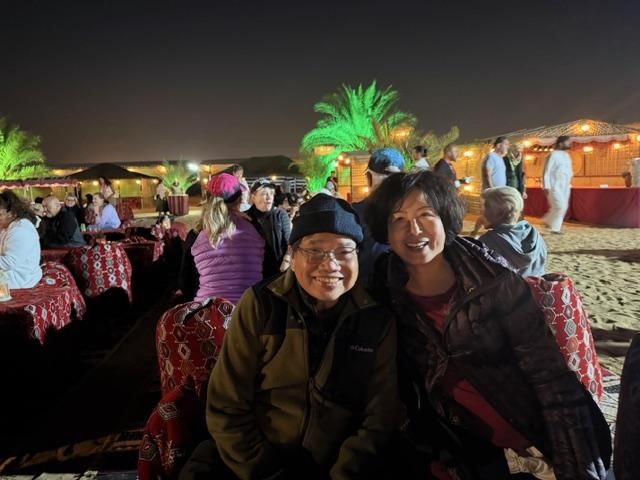 Buổi chiều chúng tôi đi Desert Safari để được trải nghiệm “dune bashing”. Khởi hành từ Dubai trên chiếc SUV với 6 hành khách và tài xế, chúng tôi tiến về hướng sa mạc với những cồn cát chập chùng. Trước khi chạy lên các đồi cát, tài xế phải xì hết bánh xe để tăng sự ma xát và diện tích tiếp xúc để có thể biểu diễn những màn bay lượn trên cát. Có khi xe nghiêng hẳn sang một bên, vậy mà không lật mới hay chứ! Trong khoảng 45 phút, hành khách cứ bặm môi, nín thở, vặn mình theo sự bay lượn của chiếc xe. Đoàn xe 5 chiếc nhào lộn trên cồn cát rất ngoạn mục. Tuy nhiên gần chót có một chiếc bị sa lầy… cát, bánh xe bị lún sâu dưới cát không chạy được nữa. Cả đoàn phải dừng lại để giúp bới cát và… đẩy. Cuối cùng rồi cũng chạy được. Mấy người tài xế có lẽ cũng quen với việc này nên không thấy họ lo lắng gì, còn mình thì… hú hồn.