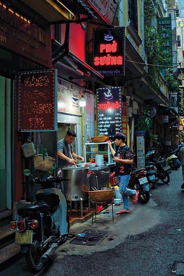 My glasses steamed up as the aroma of cardamom, cinnamon, and ginger rose from the hot soup in front of me. As I was about to plunge my chopsticks into the bowl of rice noodles and thinly sliced beef, a voice cut through Hanoi’s scooter traffic: “Excuse me.” I looked up to find a bespectacled fortysomething Vietnamese man seated several feet away. “How did you hear about this place?” Before I could even answer, he added, “No foreigners come here. No one knows about it except locals and hardcore phở lovers.”
