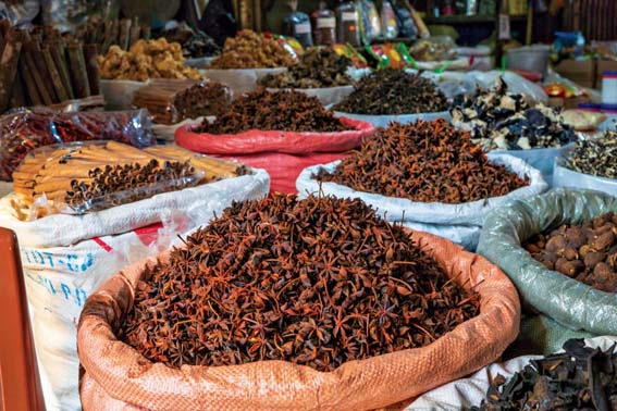 Spices fill bins at Đồng Xuân Market in Hanoi.