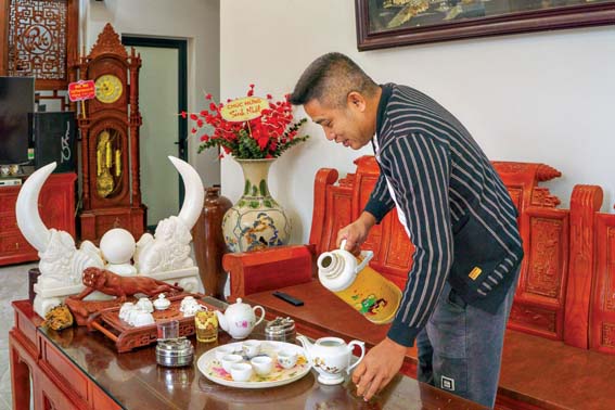 Local entrepreneur Cồ Như Đồi serves tea at his home in Vân Cù,