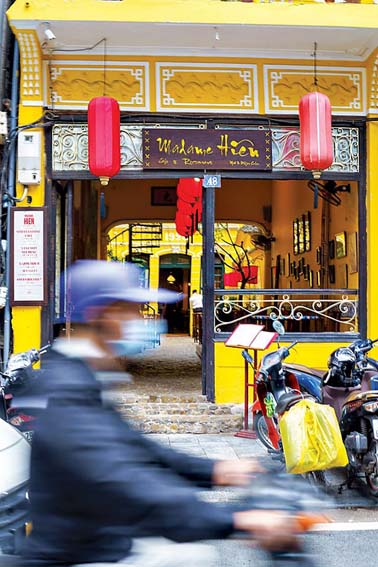 A motor scooter races past acclaimed Hanoi restaurant Madame Hien.